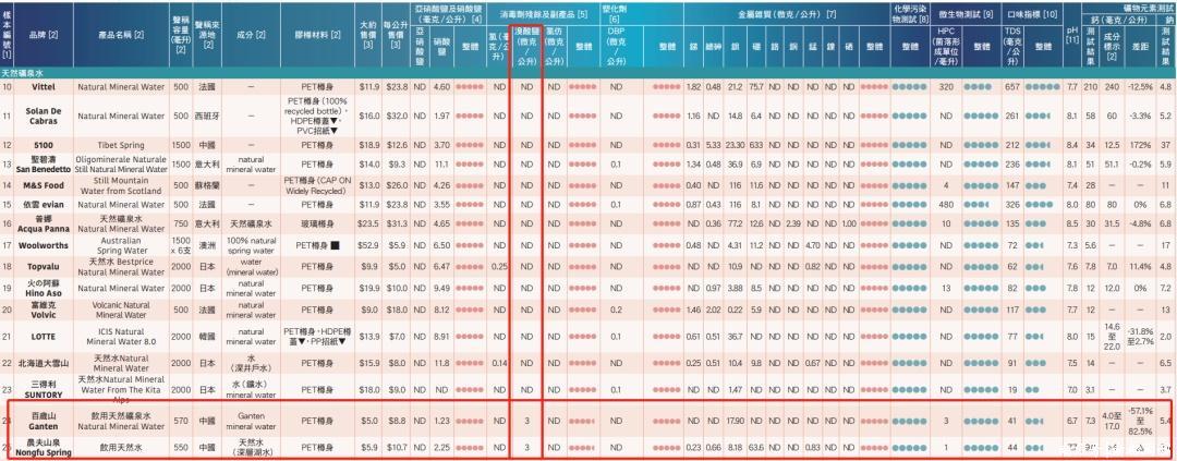 农夫山泉、百岁山测评结果(图源香港消委会)