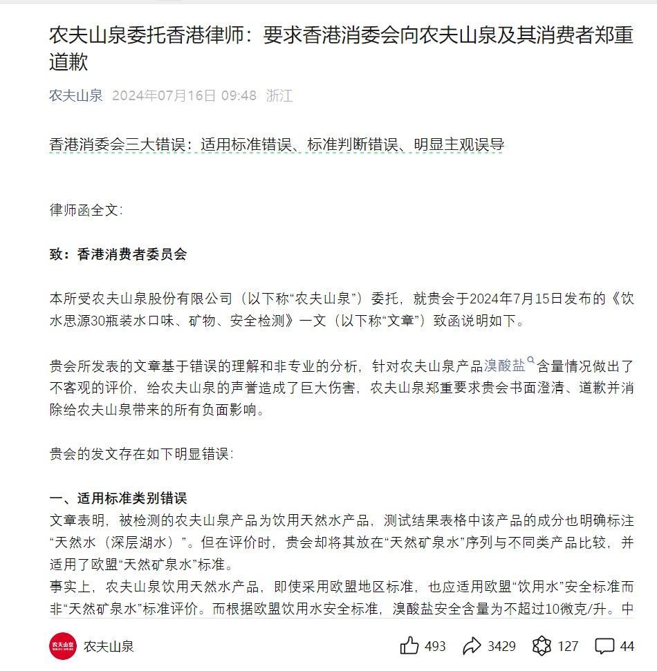 7月16日,农夫山泉官方微信公众号发布致香港消委会的律师函一文。农夫山泉方面表示,香港消委会存在三大错误,分别为适用标准错误、标准判断错误和明显主观误导。农夫山泉称,香港消委会针对农夫山泉产品溴酸盐含量情况做出了不客观的评价,给农夫山泉的声誉造成了巨大伤害,农夫山泉要求香港消委会书面澄清、道歉并消除给农夫山泉带来的所有负面影响。